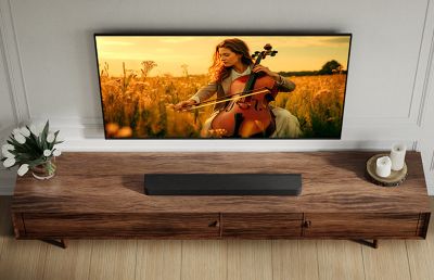 シンプルで研ぎ澄まされたデザインは、ブラビアと美しく調和。さまざまな空間に溶け込みながら、洗練された存在感をもたらします。グリル部分にファブリック素材を採用した筐体は、サウンドバー表面の光の反射を防ぎ、またサウンドバー内部が透けて見えないようにすることで、映像に没入できる視聴体験を実現します。ファブリック素材は、音質を担保しながら透けにくく、耐久性・メンテナンス性に優れた素材を選定しています。