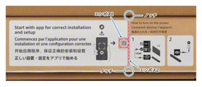 視覚障がいのあるかたがスマートフォンアプリ「BRAVIA Connect」にアクセスしやすいよう、クイックセットアップガイドにエンボス加工と切り欠きを施しました。【エンボス】(1)スマートフォンアプリ「BRAVIA Connect」ダウンロードURLのQRコードを囲むL字型の線 (2)切り込みから(1)までの点線 【ノッチ】(2)へのガイドとしてクイックセットアップガイドの両端に2つのノッチ(*)