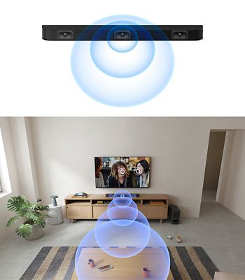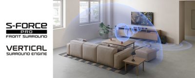 高さ方向の立体音響を表現する「Vertical Surround Engine」を大画面テレビに合わせて最適化し、さらに前後左右のサラウンドを表現する「S-Force PROフロントサラウンド」を高さ方向に拡張。従来モデルに比べてサラウンド音場を拡大しました。「Dolby Atmos(R)」や「DTS:X(R)」コンテンツだけでなく、TV番組などの2chコンテンツもリモコンのボタンひとつで大画面テレビに合った臨場感あふれる3次元の立体音響をお楽しみいただけます。