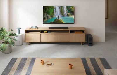 シンプルで高品位なデザインは、棚に置く・壁にかけるなど様々なシーンに自然に溶け込み、豊かなホームエンターテインメントを演出します。サウンドバーのフラットな背面は、壁にフィットしすっきりと配置することができます。