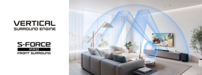 高さ方向の立体音響を表現する「Vertical Surround Engine」を大画面テレビに合わせて最適化し、さらに前後左右のサラウンドを表現する「S-Force PROフロントサラウンド」を高さ方向に拡張。従来モデルに比べてサラウンド音場を拡大しました。「Dolby Atmos(R)」や「DTS:X(R)」コンテンツだけでなく、TV番組などの2chコンテンツもリモコンのボタンひとつで大画面テレビに合った臨場感あふれる3次元の立体音響をお楽しみいただけます。