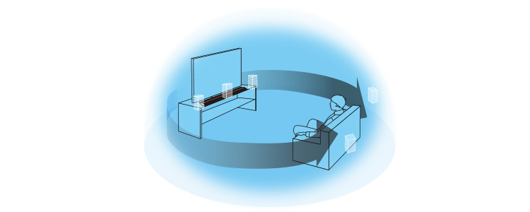 ソニー独自の高精度なデジタル音場処理技術により、前方のスピーカーだけで仮想的にサラウンド音場を再現。後方にスピーカーを置く必要がなく、すっきりとしたレイアウトで、豊かな臨場感を楽しめます。また、壁からの反射音を利用しないため、部屋の形状の影響を受けにくく、設置する場所の広さや位置にかかわらず良好なサラウンド再生を可能にします。