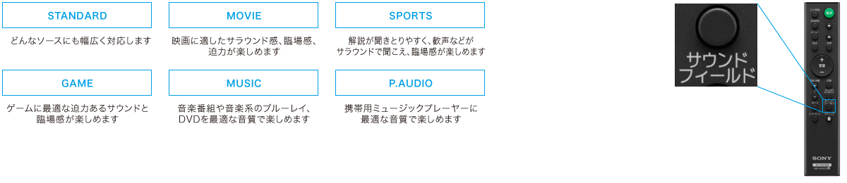リモコンの「サウンドフィールド」ボタンを押すことで、6種類の「サウンドフィールド」を切り替えることができます。コンテンツやお好みに合わせて選択できます。