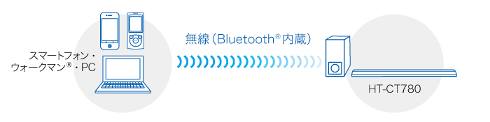 Bluetooth(R)対応により、スマートフォン、PC、ウォークマン(R)などのBluetooth(R)対応のオーディオ機器に保存された音楽をワイヤレスで簡単に操作し、約10m以内(*)の通信が可能なので、部屋中どこからでも、お好きな音楽を快適に楽しむことができます。