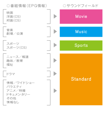 4種類のサウンドフィールドを搭載し、多彩な番組、映画、音楽を簡単に最適な設定でお楽しみいただけます。さらに、デジタル放送の視聴の際は、「オートジャンルセレクター」により、EPG情報に応じて、サウンドフィールドを自動的に切り替え(*)、最適なサウンド設定で番組を視聴いただけます。
