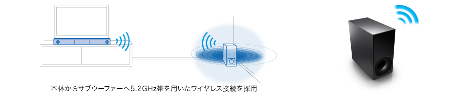 サブウーファーには、部屋の隅やソファーの後ろにも置けるように、スピーカーケーブルの配線が不要な5.2GHz帯を用いたワイヤレス接続を採用しています。