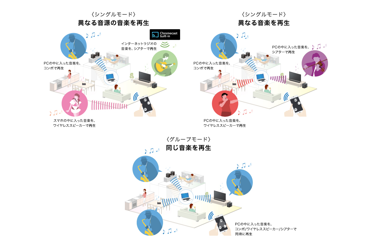 スマートフォンで「SongPal」アプリを操作することで、各部屋で同じ音楽を再生したり、異なる音楽を再生したり、異なる音源の音楽を再生したりできます。異なる部屋の「SongPal Link」に対応したオーディオ機器を操作して、PCやNASに保存した音楽や、ミュージックサービスの音楽をそれぞれの機器で再生できます。また、オーディオ機器をグループ化することも可能。グループ化したオーディオ機器が置いてある部屋で、同じ音楽を同時に再生することも可能です。
