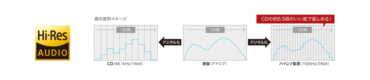 ハイレゾ音源とは、音楽CD(44.1kHz/16bit)を超える情報量を持つ音楽データのこと。音楽CDではカットしてしまう音も収録できるので、今まで聞こえなかった曲のディテールやニュアンスまでも肌で感じることができます。まるでレコーディングスタジオやコンサートホールで聞いているかのような、かつてない臨場感を体感できます。