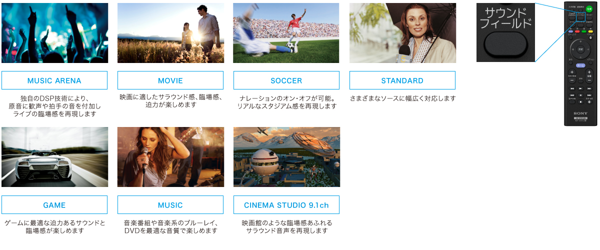 リモコンの「サウンドフィールド」ボタンを押すことで、さまざまな種類の音源に合わせた「サウンドフィールド」を切り替えることができます。コンテンツやお好みに合わせて選択できます。