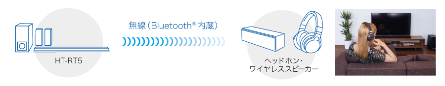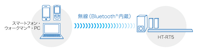 Bluetooth(R)対応により、スマートフォン、PC、ウォークマン(R)などのBluetooth(R)対応のオーディオ機器に保存された音楽をワイヤレスで簡単に操作し、約10m以内(*)の通信が可能。部屋中どこからでも、お好きな音楽を快適に楽しむことができます。サラウンドモード選択で「ClearAudio+」の場合、リアスピーカーからもサウンドが再生されます。
