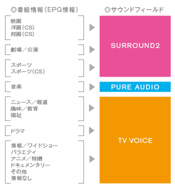 デジタル放送の視聴の際は、「オートジャンルセレクター」により、EPG情報に応じて、サウンドフィールドを自動的に切り替え(*)、最適なサウンド設定で番組を視聴いただけます。