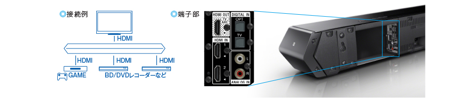 HDMIの入力を3系統搭載。ブルーレイディスクレコーダー/プレーヤー/PS3等のゲーム機、衛星放送チューナー、ケーブルテレビチューナー、ビデオカメラ等、最大3つの機器と接続し、さまざまなコンテンツを高音質なサラウンドでお楽しみいただけます。