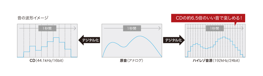 ハイレゾ音源とは、音楽CD(44.1kHz/16bit)を超える情報量を持つ音楽データのこと。音楽CDではカットしてしまう音も収録できるので、今まで聴こえなかった曲のディテールやニュアンスまでも肌で感じることができます。まるでレコーディングスタジオやコンサートホールで聴いているかのような、かつてない臨場感を体感できます。