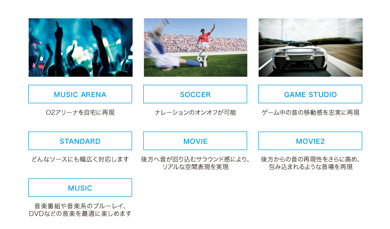ソニー・コンピュータ エンタテインメントのサウンドデザイナーの意見を元に、制作者の意図を目指して調整された「GAME STUDIO」。サンパウロ・モルンビースタジアムの音場を測定した「サッカーモード」。そして、ロンドンにある世界最大規模のコンサートホール「O2アリーナ」の音の響きを再現する「デジタルミュージックアリーナ」など。ソニー独自の測定・DSP技術と、ソフト制作者や音響のプロとのコラボレーションにより、その場にいるような臨場感を創りだします。また、標準の音声を再生する「STANDARD」、映画館ならではの豊かな響きを味わえる「MOVIE」、最適なサラウンド効果で音楽を楽しめる「MUSIC」などのサウンドモードも備えています。