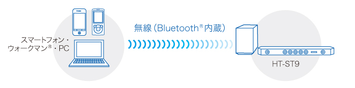 Bluetooth(R)対応により、スマートフォン、PC、ウォークマン(R)などのBluetooth(R)対応のオーディオ機器に保存された音楽をワイヤレスで簡単に操作し、約10m以内(*)の通信が可能なので、部屋中どこからでも、お好きな音楽を快適に楽しむことができます。