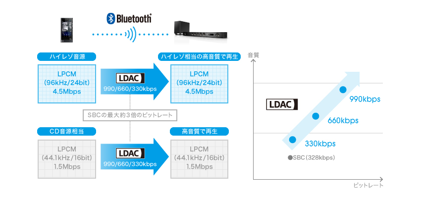 ワイヤレス環境に応じて選べる複数の伝送レートをサポートするLDACは、ハイレゾ音源を990kbps(従来のBluetooth(R)Audioの最大約3倍の情報量)の最大速度で伝送することで、ハイレゾ音源をハイレゾ相当の音質で再現します。LDACに対応した機器間では、さまざまな音源を高音質なサウンドでお楽しみいただけます。