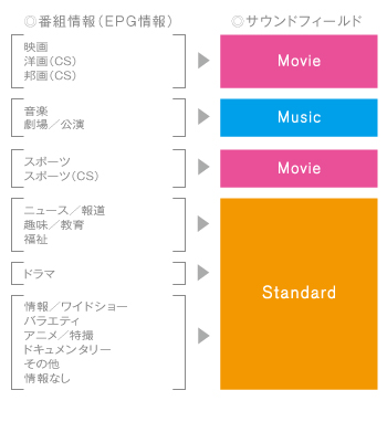 4種類のサウンドフィールドを搭載し、多彩な番組、映画、音楽を簡単に最適な設定でお楽しみいただけます。さらに、デジタル放送の視聴の際は、「オートジャンルセレクター」により、EPG情報に応じて、サウンドフィールドを自動的に切り替え(*)、最適なサウンド設定で番組を視聴いただけます。