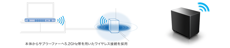 サブウーファーには、部屋の隅やソファーの後ろにも置けるように、スピーカーケーブルの配線が不要な5.2GHz帯を用いたワイヤレス接続を採用しています。