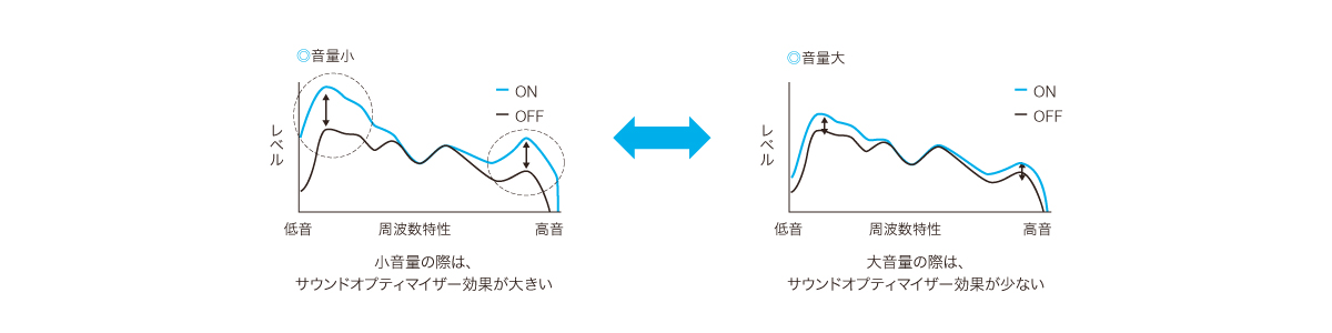 大迫力の映画などを視聴する際、周囲への配慮でボリュームを絞ってしまうと中域音に比べ高域音と低域音のレベルが早い段階で落ち、コンテンツに収録されているサウンドのバランスが崩れる傾向にあります。これによりボリュームを絞った際の聞きとりにくさにつながります。サウンドオプティマイザーはボリュームを下げても、コンテンツに本来収録されている周波数特性を人間の聴感特性に合わせて補正し、小音量でも豊かな音場効果を再現します。