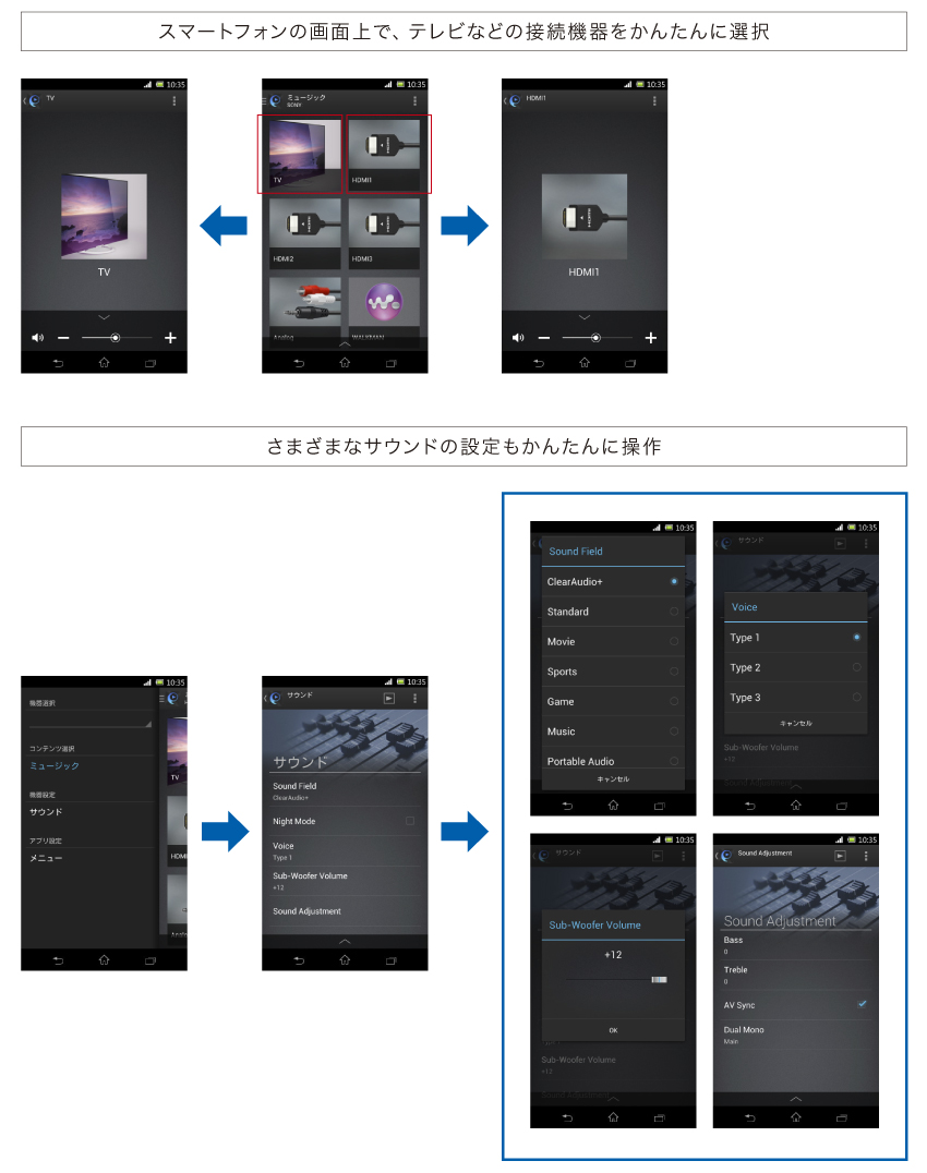 「SongPal」はソニーのさまざまなオーディオ商品をタッチ操作で快適に操作できる独自アプリ。Bluetooth接続で、ホームシアターシステムの音質・音量、サウンドフィールド、入力切り替えなどの操作ができます。AndroidOS、iOS端末のそれぞれにアプリを提供しており、お持ちの端末ですぐに使えます。