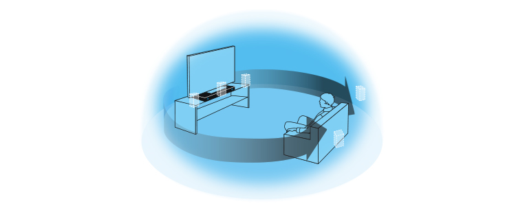 ソニー独自の高精度なデジタル音場処理技術により、前方のスピーカーだけで仮想的にサラウンド音場を再現。後方にスピーカーを置く必要がなく、すっきりとしたレイアウトで、豊かな臨場感を楽しめます。また、壁からの反射音を利用しないため、部屋の形状の影響を受けにくく、設置する場所の広さや位置にかかわらず良好なサラウンド再生を可能にします。