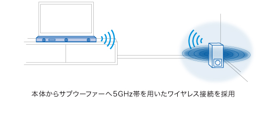 サブウーファーには部屋の隅やソファーの後ろにも置けるように、スピーカーケーブルの配線が不要な5GHz帯を用いたワイヤレス接続を採用しています。