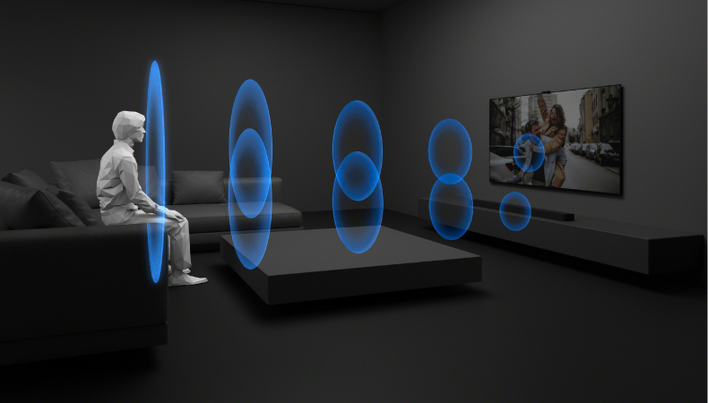 専用アプリ「BRAVIA Connect」からサウンドフィールド最適化を実行することで、天井と両側の壁までの距離を自動で計測。理想的な音響特性に自動調整します。また、視聴位置に応じた測定・最適化もアプリを通して簡単な操作で行うことができ、ご自宅の視聴環境にぴったりの音響でお楽しみいただけます。