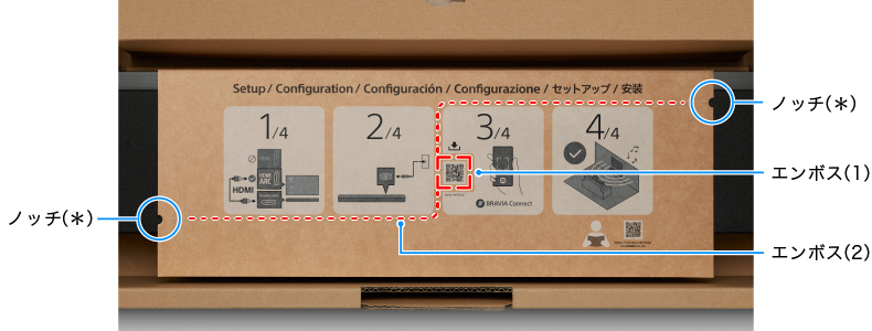 視覚障がいのあるかたがスマートフォンアプリ「BRAVIA Connect」にアクセスしやすいよう、クイックセットアップガイドにエンボス加工と切り欠きを施しました。【エンボス】(1)スマートフォンアプリ「BRAVIA Connect」ダウンロードURLのQRコードを囲むL字型の線 (2)切り込みから(1)までの点線 【ノッチ】(2)へのガイドとしてクイックセットアップガイドの両端に2つのノッチ(*)