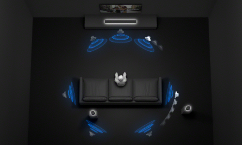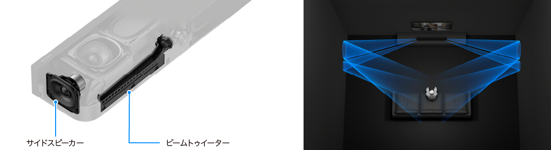 バースピーカーの両側面にサイドスピーカー、前面左右にビームトゥイーターを搭載。フルレンジのサイドスピーカーと指向性の強い音を放射するビームトゥイーター、2つのユニットの特長を組み合わせて壁に音を反射させることでワイドなサラウンドサウンドを実現し、広大な音場と圧倒的な臨場感をもたらします。