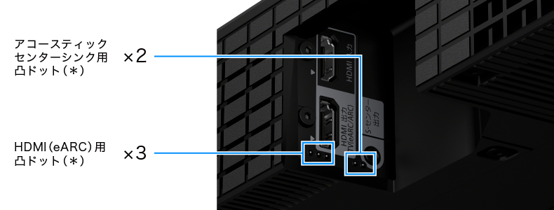 また、HDMI(eARC)/アコースティックセンターシンク端子付近に、端子の位置や種類が識別しやすいように凸ドット(*)を施しセットアップしやすくなりました。