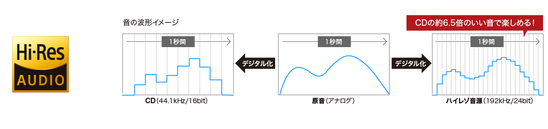 ハイレゾ音源とは、音楽CD(44.1kHz/16bit)を超える情報量を持つ音楽データのこと。音楽CDではカットしてしまう音も収録できるので、今まで聞こえなかった曲のディテールやニュアンスまでも肌で感じることができます。まるでレコーディングスタジオやコンサートホールで聞いているかのような、かつてない臨場感を体感できます。