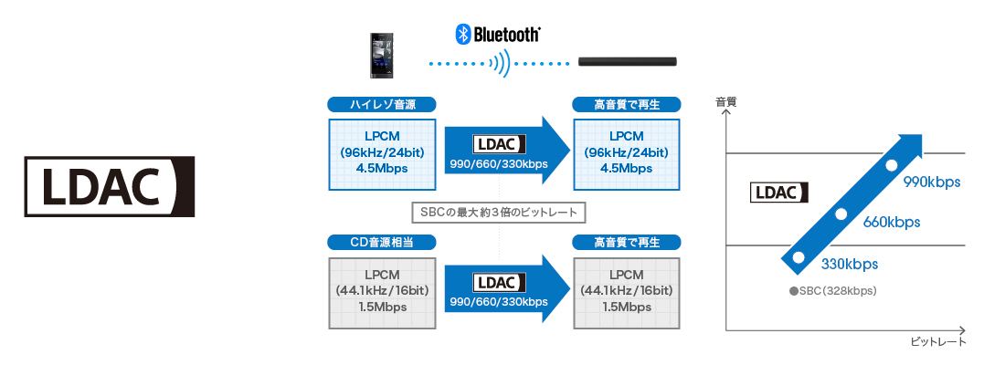 *1 LDACは日本オーディオ協会の“Hi-Res Audio Wireless”に認定されたコーデック技術です *2 Bluetooth A2DPのSBCとの比較。ハイレゾコンテンツを転送速度990kbpsで伝送する場合