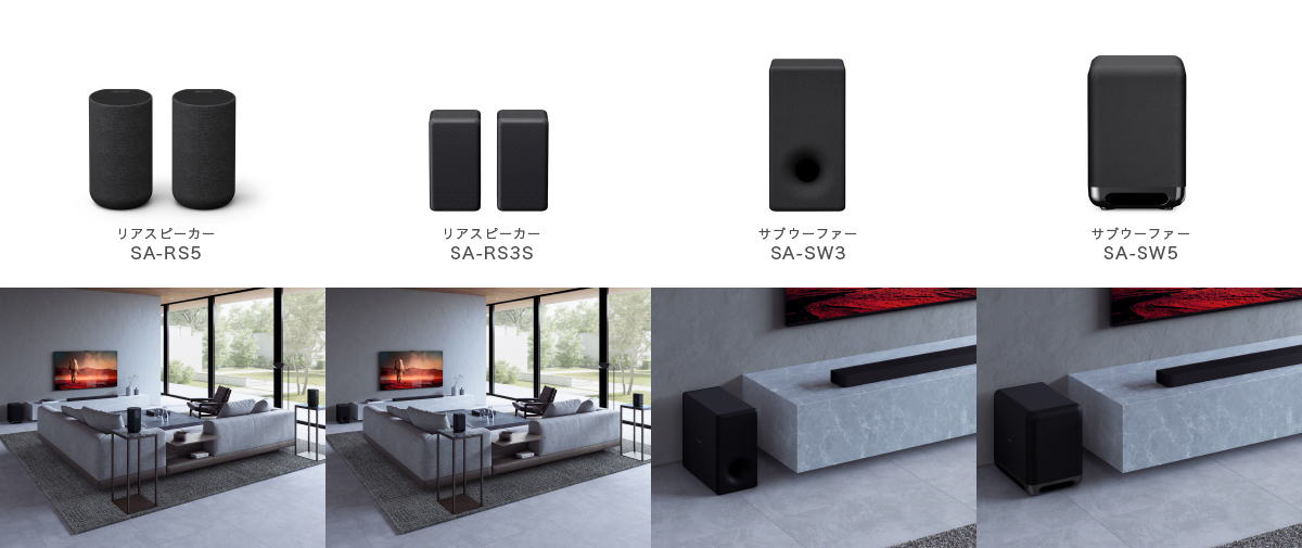 自分の好みや環境に合った低音・サラウンドサウンドに拡張することができる別売りのサブウーファーとリアスピーカーをラインアップ。サブウーファーはサウンドバーからの低音に加えて、より深く迫力のある低音をプラスすることができます。リアスピーカーは、後方からのリアルサラウンドを加えることにより、さらに臨場感豊かにサラウンドサウンを楽しむことができます。サブウーファーとリアスピーカーはお好みに合わせて自由に組み合わせることができ、サウンドバーとワイヤレス接続により配線不要で使用することができます。