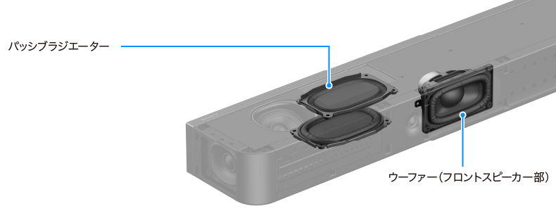 サウンドバー本体の天面と底面に合計4基のパッシブラジエーターを内蔵。フロントスピーカー部のウーファーとの組み合わせにより低音域の増強を行うことで豊かな低音を実現し、従来機種(HT-A7000)と同等の低音再生能力と本体の小型化を両立しています。