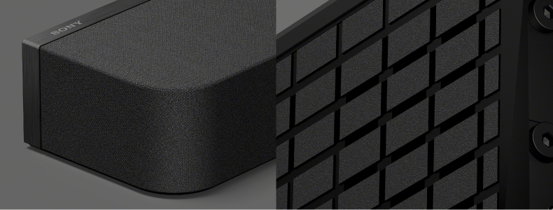 シンプルで研ぎ澄まされたデザインは、ブラビアと美しく調和。さまざまな空間に溶け込みながら、洗練された存在感をもたらします。グリル部分にファブリック素材を採用した筐体は、サウンドバー表面の光の反射を防ぎ、またサウンドバー内部が透けて見えないようにすることで、映像に没入できる視聴体験を実現します。ファブリック素材は、音質を担保しながら透けにくく、耐久性・メンテナンス性に優れた素材を選定しています。