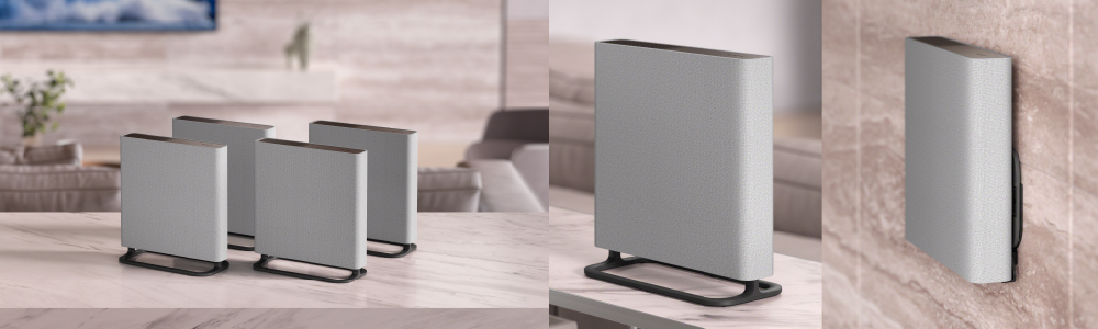 ライトグレーのファブリック素材を採用し、リビングに溶け込むスリムデザイン。棚や台に置くだけでなく、テレビと合わせて壁掛けにもあう薄型フォルム。自然な形で広大な音場空間を楽しむことができます。