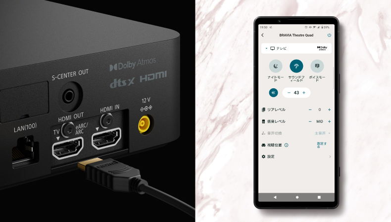 「アコースティックセンターシンク」により、ブラビアの対応モデルをセンタースピーカーとして駆動できます。センタースピーカーとしてテレビからも音を出すことで、定位感が向上し、より臨場感のある体験が可能です。 ※ アコースティックセンターシンク対応ブラビア:S-センタースピーカー入力端子搭載モデルについて詳しくは ブラビア商品ページをご確認ください