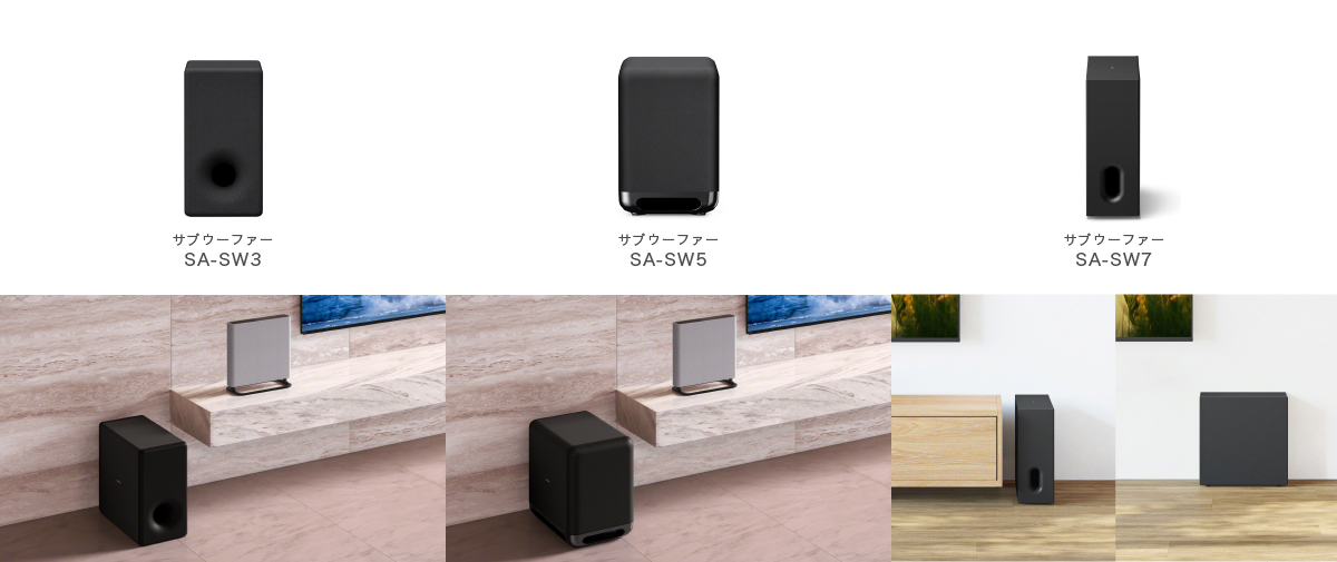 自分の好みや環境に合った低音・サラウンドサウンドに拡張するためサブウーファーを別売りで用意。サブウーファーはホームシアターシステムからの低音に加えて、より深く迫力のある低音をプラスすることができます。