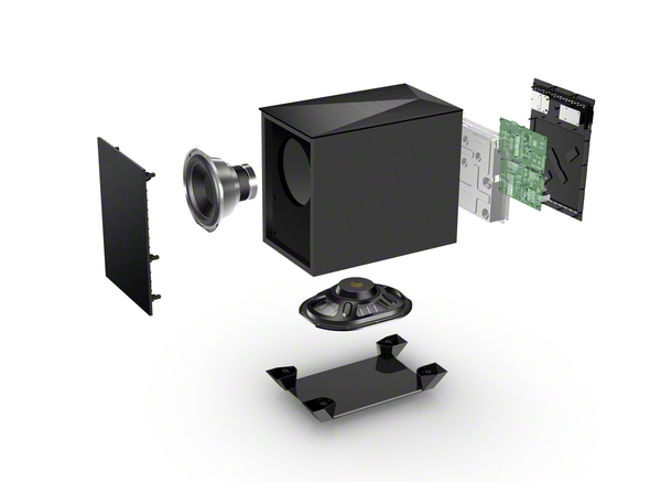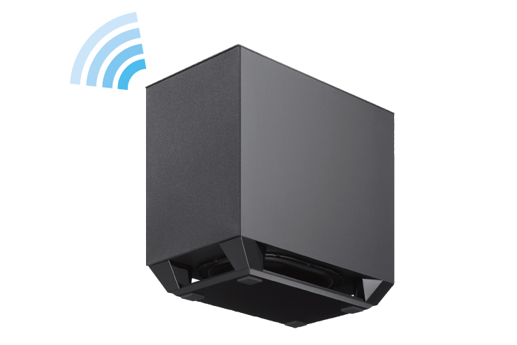 一般的にパッケージシアターのサブウーファーは、アンプのDSPで制御されています。一方、本機は、サブウーファー自体に、ユニットの振動を制御するためのDSPが搭載されています。映画の大音量のシーンなど、一時的に大音量を出すと、サブウーファーのユニットが大きく振幅します。その振幅エネルギーは、すぐには抑まらず、必要以上の振動がユニット内部で発生してし、「ひずみ」となって、耳障りな音につながってしまいます。この不要な振動を抑えるには、振動発生直後の高速処理が必要です。そのため、本機はサブウーファー内部にDSPを搭載し、より高速で、高精度な制御を実現しました。