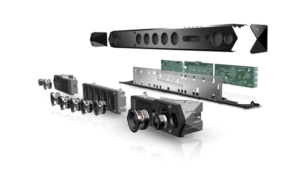 メインユニットに、7基の65mmの磁性流体スピーカーを搭載。スピーカーからダンパーをなくし、ボイスコイルを駆動する磁気ギャップ部に独自開発の「磁性流体」サスペンション構造を採用。音のひずみを抑えるとともに音圧が増し、高音質で伸びのあるボーカルを楽しめます。従来は上下に動くボイスコイルをダンパーによってサスペンションしていましたが、“磁性流体”をサスペンションに応用する技術を開発し、スピーカーのダンパーレス化を実現。ダンパーをなくすことで、音のひずみを抑えるとともに音圧が増し、高音質で伸びのあるボーカルを楽しめるようになりました。さらに磁性流体構造と大型ユニットの組み合わせにより、1音1音のクオリティーが格段に向上し、映画の重要な要素である俳優の魅力を高めるセリフの明瞭さ、圧倒的に密度の濃い音楽再現を実現しました。