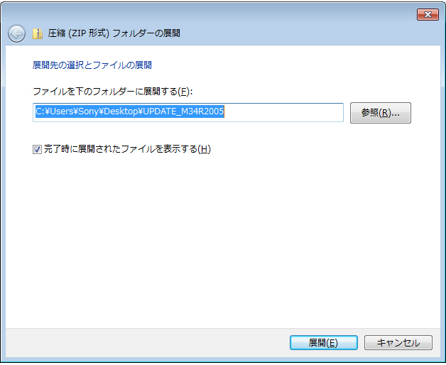 [9] 上記の画面の「ファイルをすべて展開」を選択すると以下の画面が表示されます。アップデート用データをデスクトップに置く場合は、展開するフォルダを修正せずに、「展開」を選択してください。