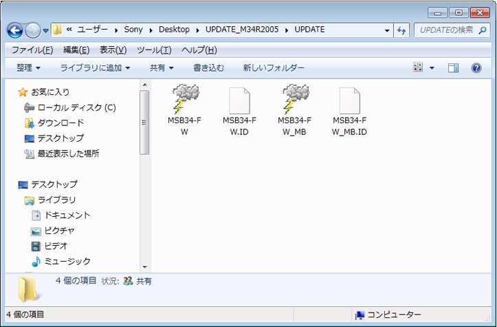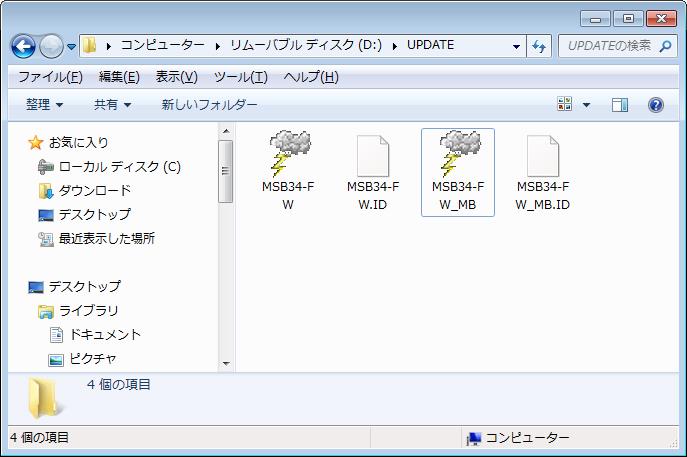 [14] コピーした「UPDATE」フォルダの中に、4つのアップデート用データ「MSB34-FW.BIN」、「MSB34-FW.ID」、「MSB34-FW_MB.BIN」、「MSB34-FW_MB.ID」がある事を確認してください。