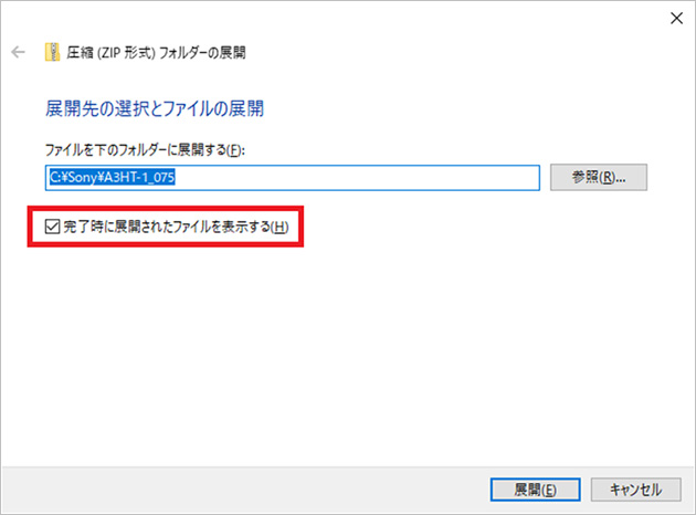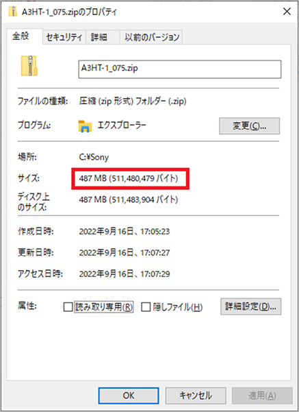 以下、アップデートzipファイル名がA3HT-1_075.zip、アップデートzipファイルサイズが487 MB (511,480,479 バイト)の場合を例として、インターネットからPCへダウンロードしたzipファイルを、PC上でUPGファイルに展開し、USBメモリーへ転送する手順を説明しています。