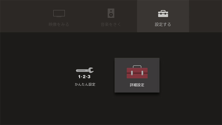 「↓」「←」「→」ボタンを使って、画面下段の「詳細設定」を選び、
