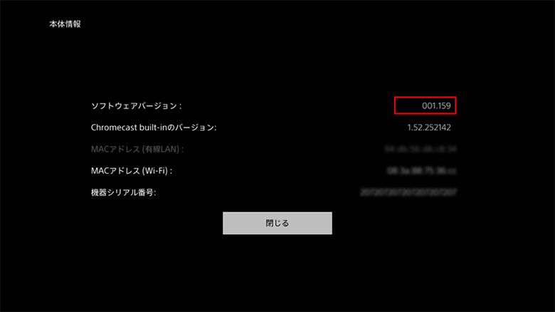 ※画像は Version 1.159のときの例です。また、MACアドレス、機器シリアル番号は、本アップデートとは関係ありません 。