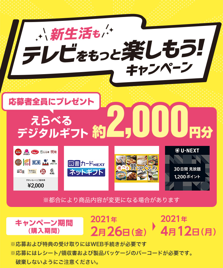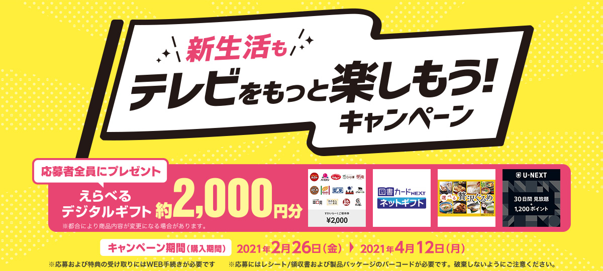 新生活もテレビをもっと楽しもうキャンペーン(以下「本キャンペーン」)では、キャンペーン期間(購入期間)内に対象商品を購入し、製品登録のうえ当社指定の手続きに従い応募期間内に不備なくご応募されたお客様に、えらべるデジタルギフト約2,000円分をもれなくプレゼントいたします。