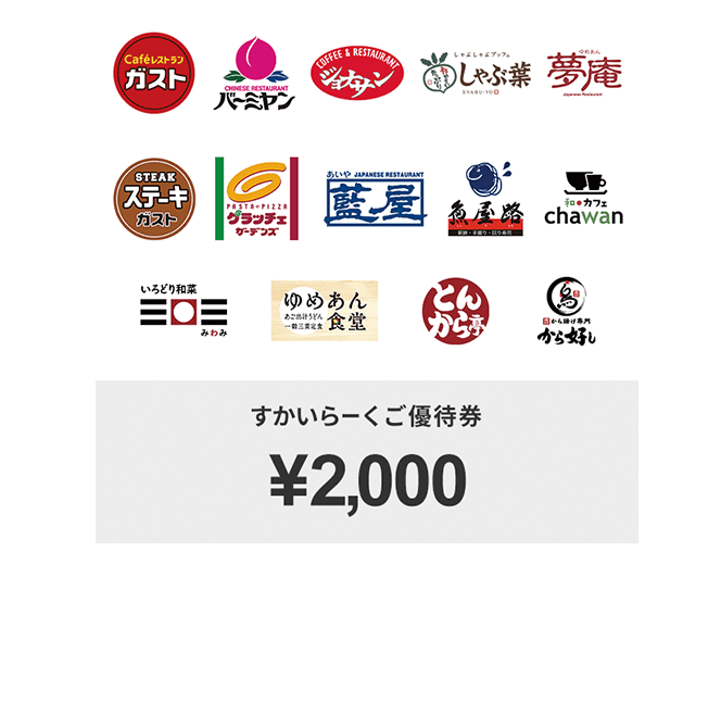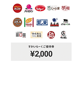 「すかいらーくご優待券 (2,000円)」「図書カードネットギフト (2,000円)」「選べる贅沢グルメデジタルギフト 2000 (2,000円)」「U-NEXTギフトコード 30日間見放題+1200ポイント(1,990円)」の中から1つ、お好きなものをお選びいただけます。