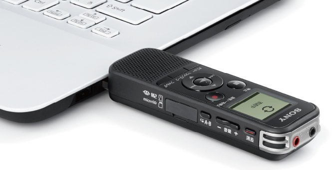 直接パソコンと接続できるスライド式USB端子を搭載。ケーブルいらずで音声や音楽ファイル、データを転送できます。