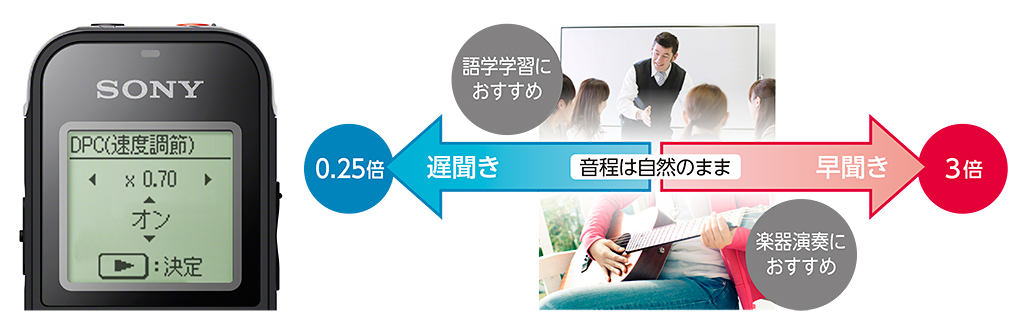 「DPC(Digital Pitch Control)」機能を使うと、再生速度を0.25倍速から3.00倍速の間で調節できます。その際、音程はデジタル処理により、自然に近いレベルで再生されます。