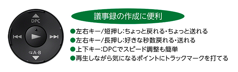 ひとつのファイル内で10秒の早送り、3秒の早戻しができます。「DPC(Digital Pitch Control)」機能で速度を調節しながら早送り/早戻しを使えるので、議事録などの書き起こしの際に便利です。